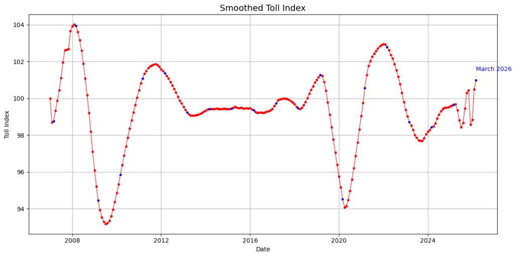 I have been presenting the Toll Index in “raw form” putting off having to do the work to account for structural changes in the MAUT rules (e.g. including trucks of lower tonnage, adding more highways etc). In July of 2024 yet another change took place so I decided to do the econometric work to produce an index without the effect of the various MAUT reforms (see here).