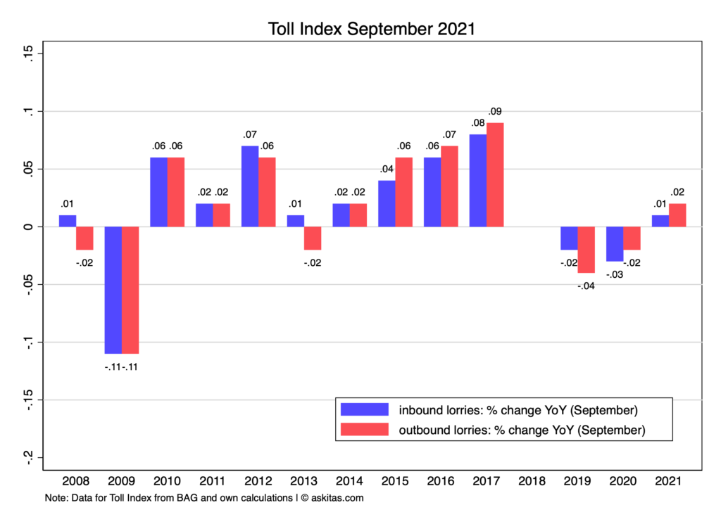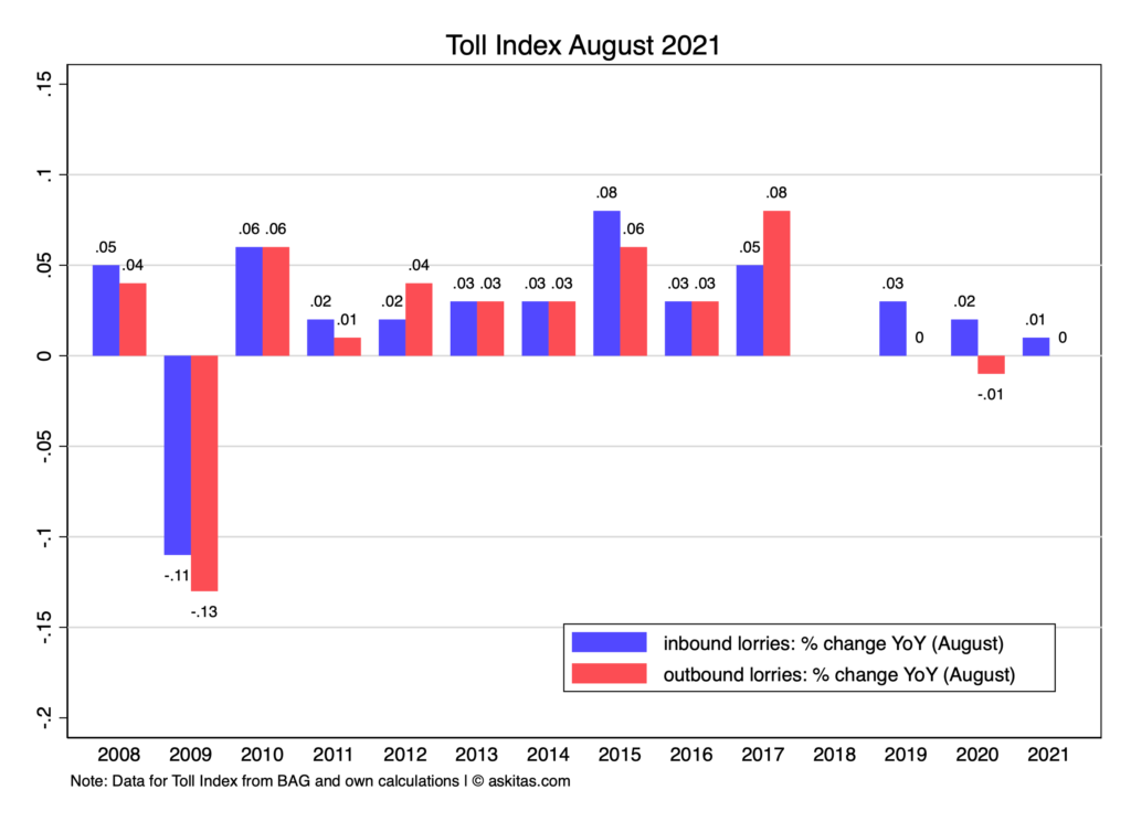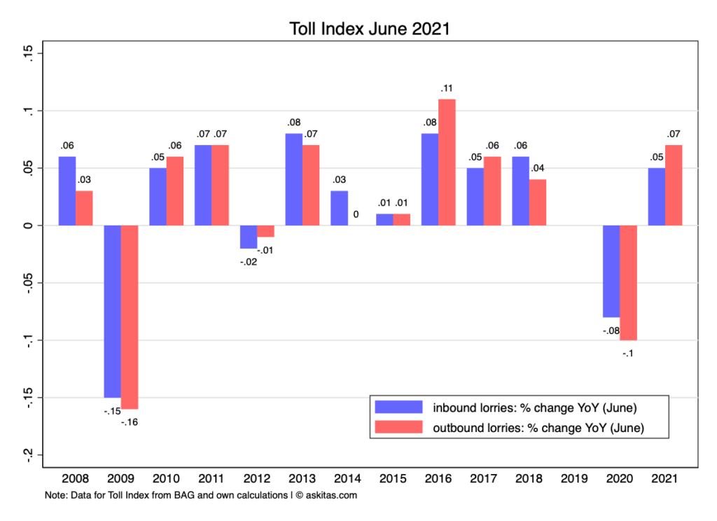 While in the long run this is bound to make the Toll Index more accurate this introduced a discontinuity. The BAG even had difficulty producing the numbers timely for about year. After July 2019 we can report year on year changes for each month (with a missing value in 2018 for all months from July to December and a missing value in 2019 for all months from January to June.