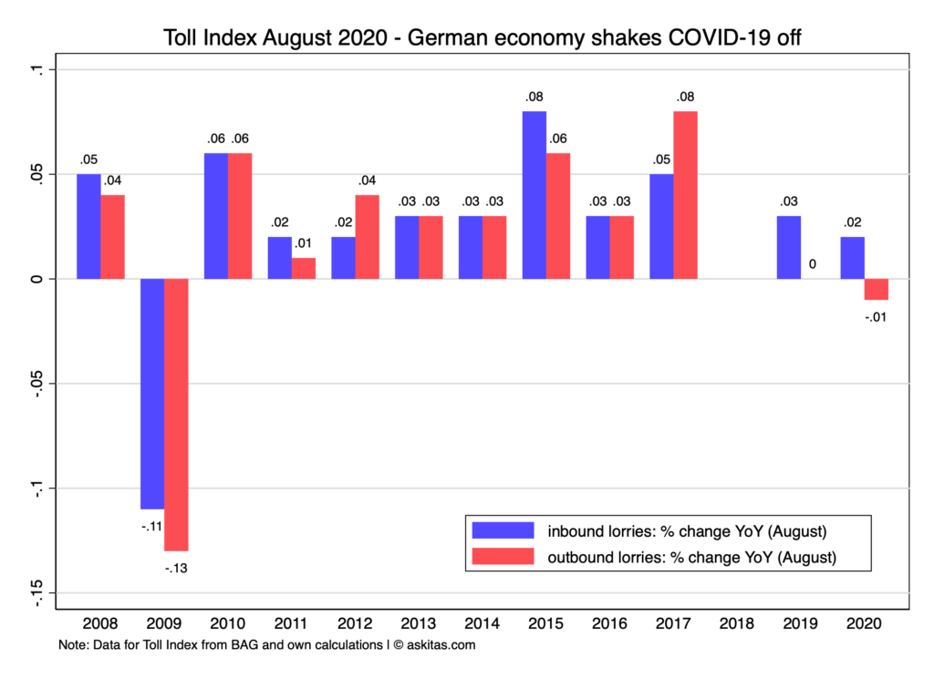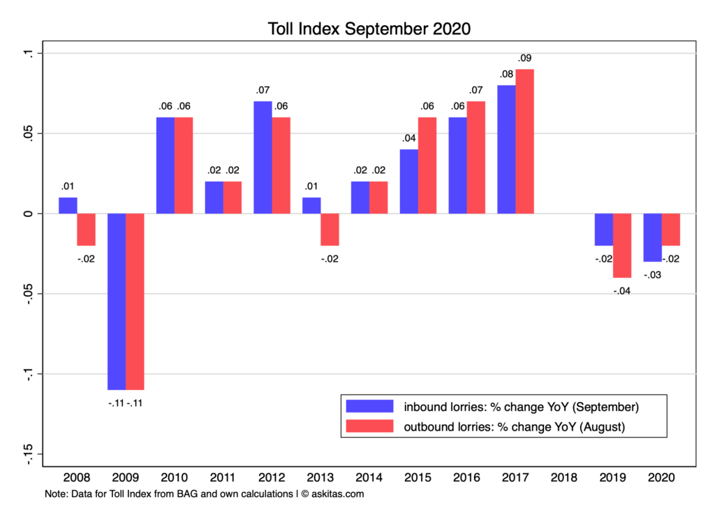 While in the long run this is bound to make the Toll Index more accurate in these past twelve months it made it useless for nowcasting. Moreover the BAG had difficulty producing the numbers timely for about year. After July 2019 we can report year on year changes for each month (with a missing value in 2018 for all months from July to December and a missing value in 2019 for all months from January to June.